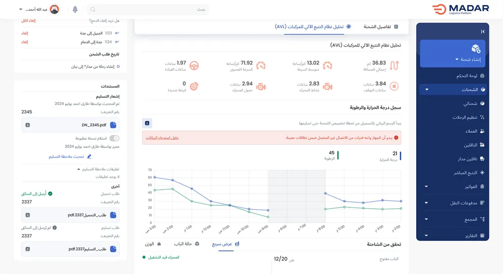 تمكنك المنصة من تدقيق بيانات أي شحنة فورياً، مع الوصول إلى سجل مسار الشحنة ، السجلات التشغيلية، التوقيت المتوقع للوصول، زمن التنقل الكامل، الوثائق المرفقة، وغيرها من التفاصيل
