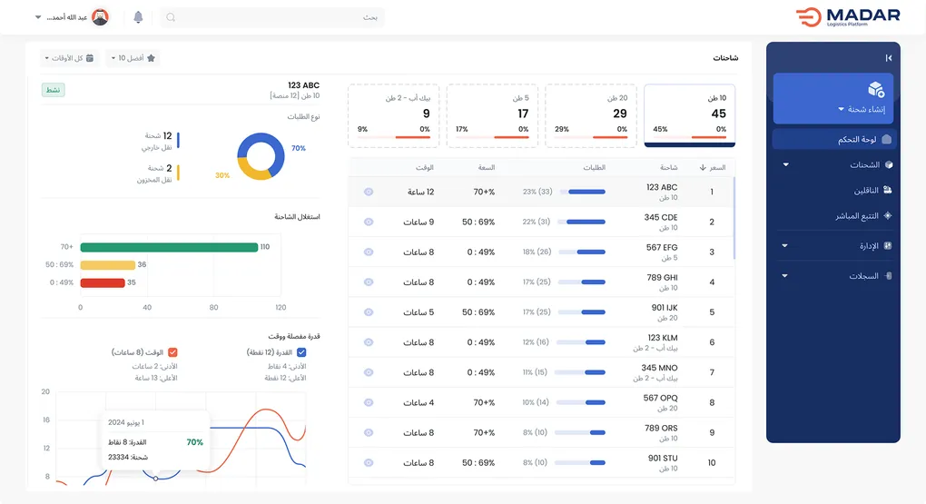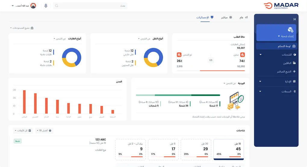 تحكّم بكامل عملياتك اللوجستية بثقة وذكاء مع لوحة التحكم المركزية من مدار — أداة متكاملة تمنحك رؤية فورية للشحنات، وتنفيذًا سلسًا للطلبات، وإدارة فعّالة لعمليات التحميل والتفريغ، مدعومة ببيانات لحظية.